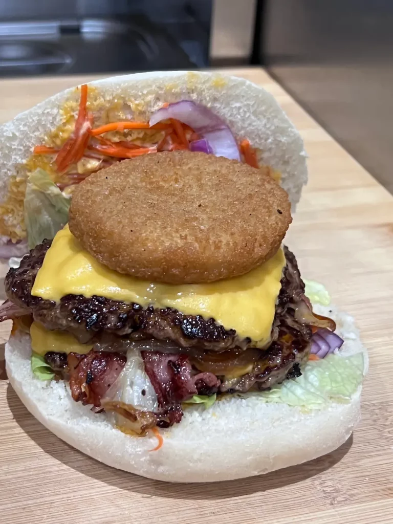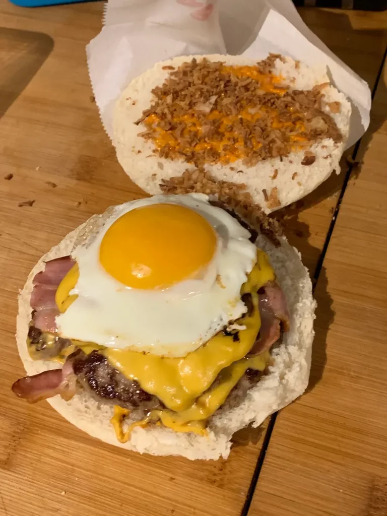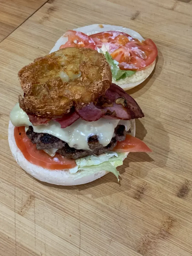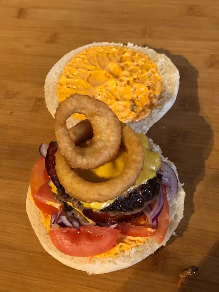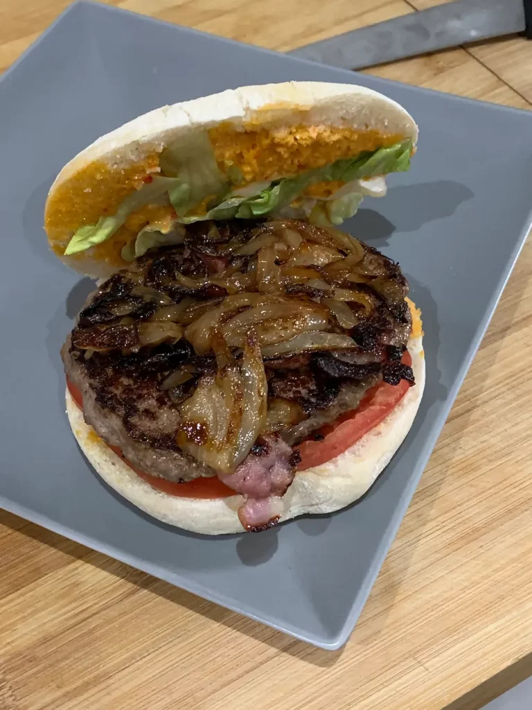 Cheddar, lard grillé, oignons secs, oignons rissolés à la taque, sauce andalouse et son œuf à cheval.