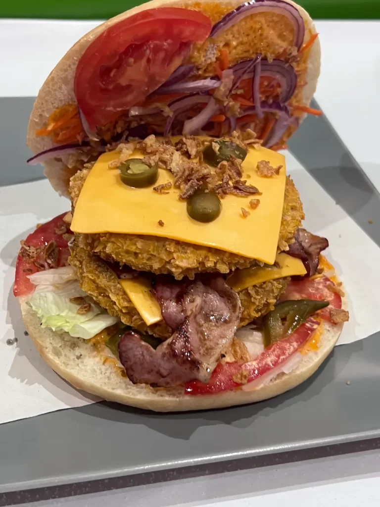 Chips de chorizo, cheddar, beignets d’oignons rings, tomates, oignons rouges et sa sauce mayonnaise aux piments jalapeños.
