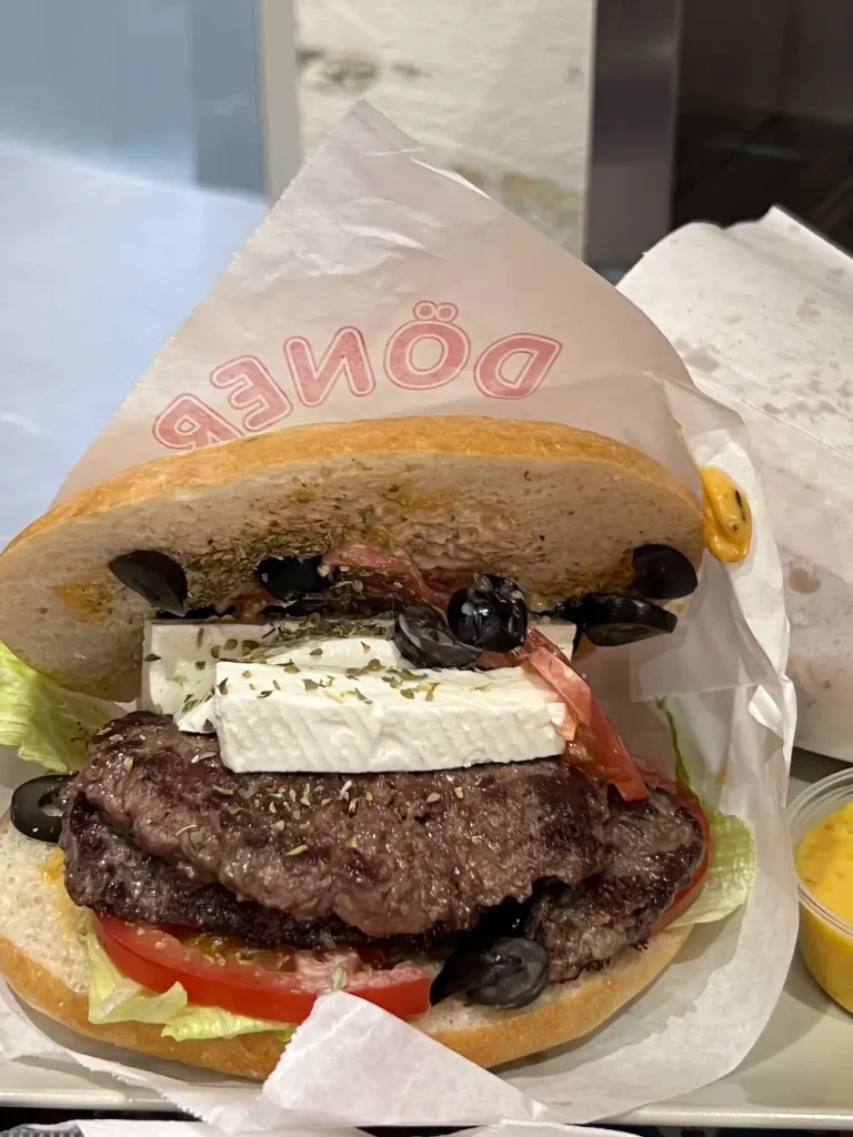 Sauce pita ou pita hot, feta, olives noires, salade, tomates, origan.